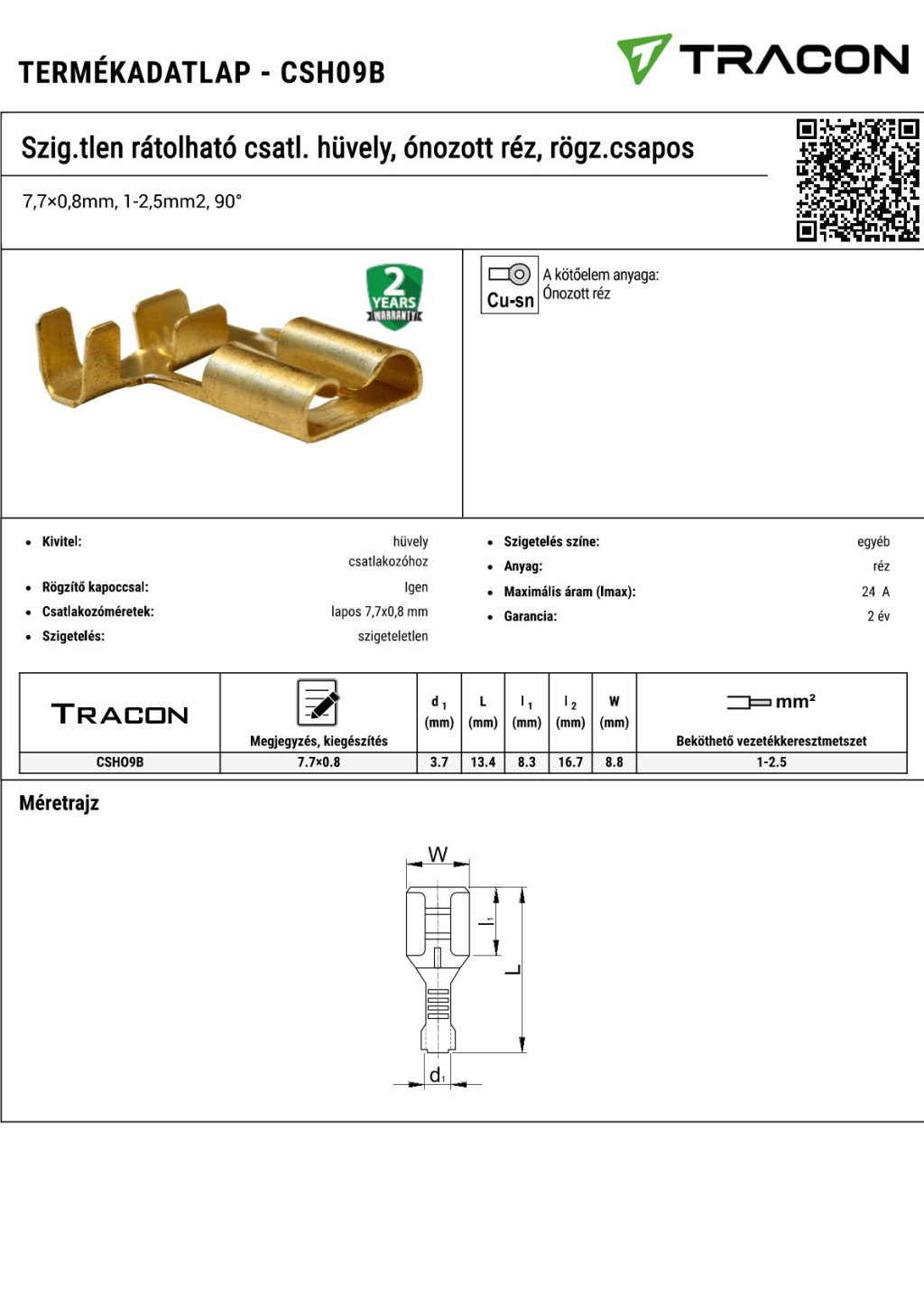 CSH6-B Szig.tlen rátolható csatl. hüvely, sárgaréz, rögz.csapos6,3×0,8mm, 1-2,5mm2