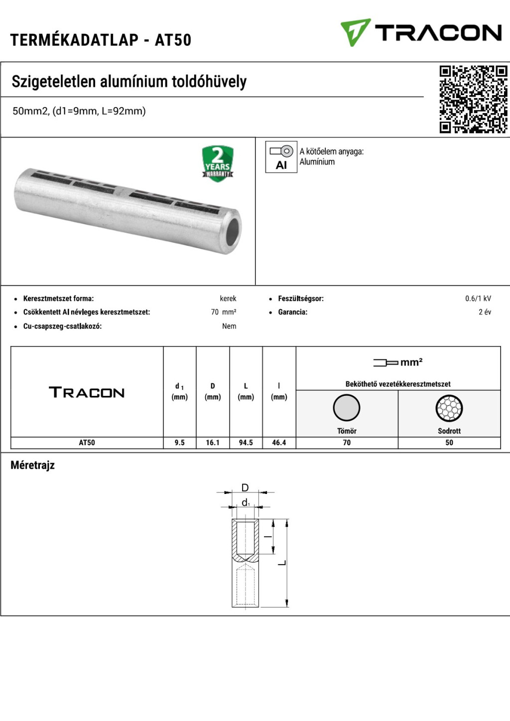 AT50 Szigeteletlen alumínium toldóhüvely50mm2, (d1=9mm, L=92mm)
