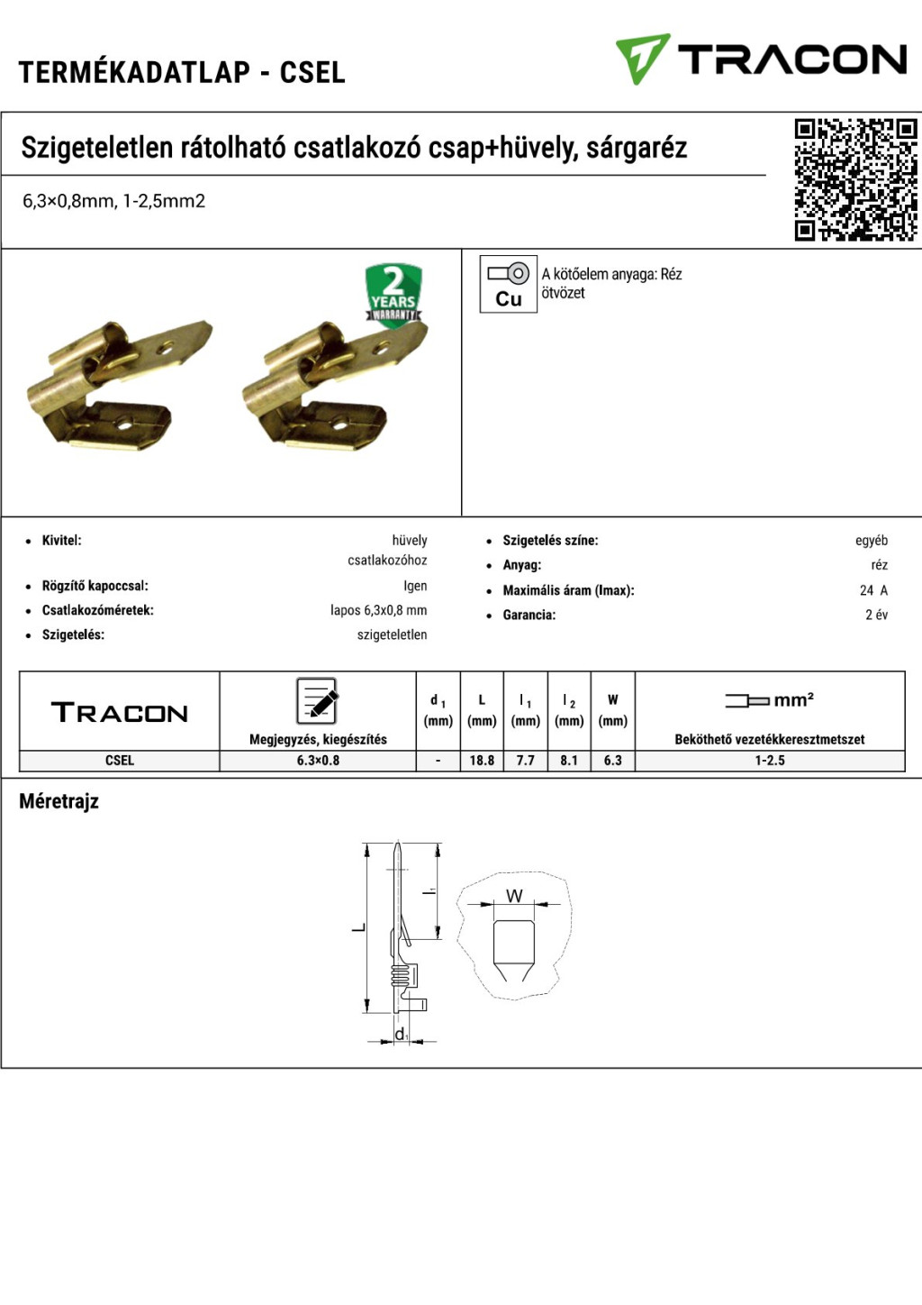 CSEL Szigeteletlen rátolható csatlakozó csap+hüvely, sárgaréz6,3×0,8mm, 1-2,5mm2
