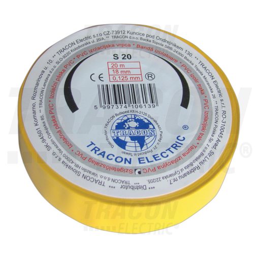 S20 Szigetelőszalag, sárga20m×18mm, PVC, 0-90°C, 40kV/mm
