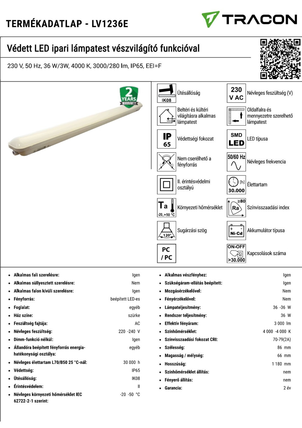LV1236E Védett LED ipari lámpatest vészvilágító funkcióval230 V, 50 Hz, 36 W/3W, 4000 K, 3000/280 lm