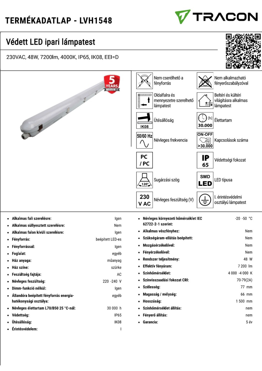 LVH1548 Védett LED ipari lámpatest230VAC, 48W, 7200lm, 4000K, IP65, IK08, EEI=D