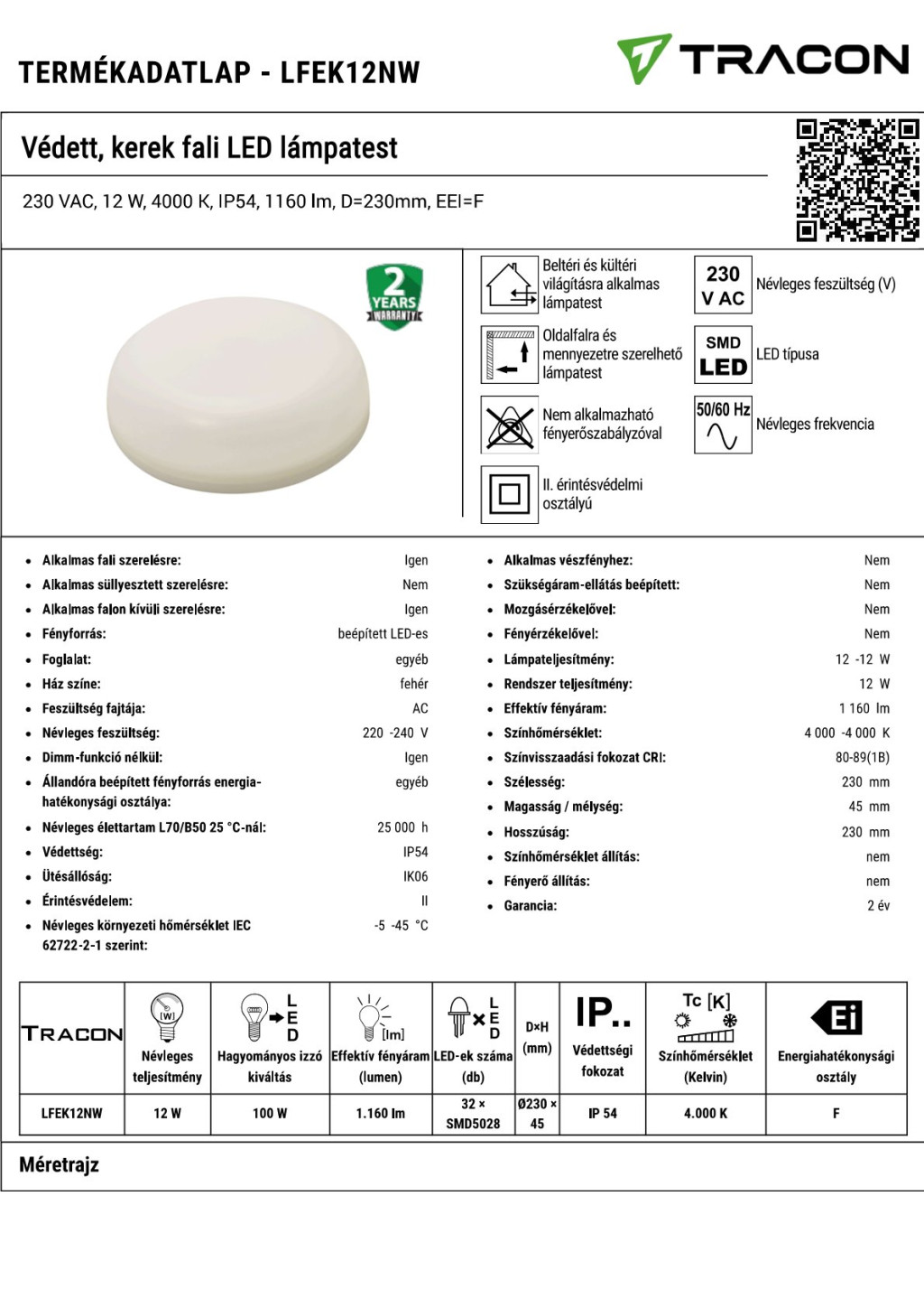 LFEK12NW Védett, kerek fali LED lámpatest230 VAC, 12 W, 4000 K, IP54, 1160 lm, D=230mm, EEI=F