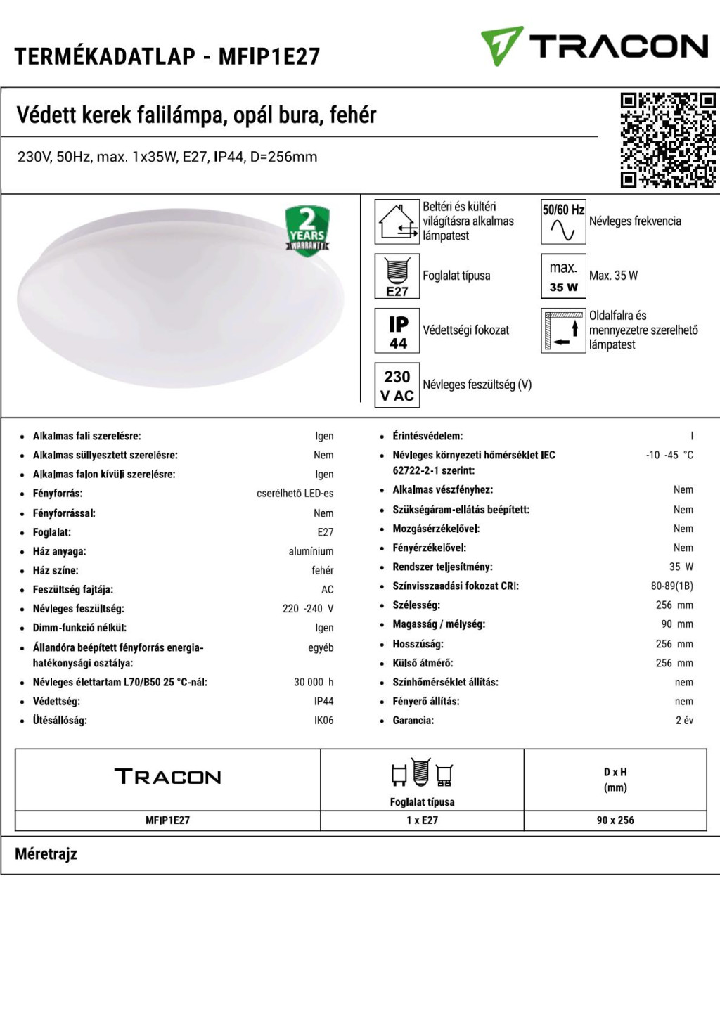 MFIP1E27 Védett kerek falilámpa, opál bura, fehér