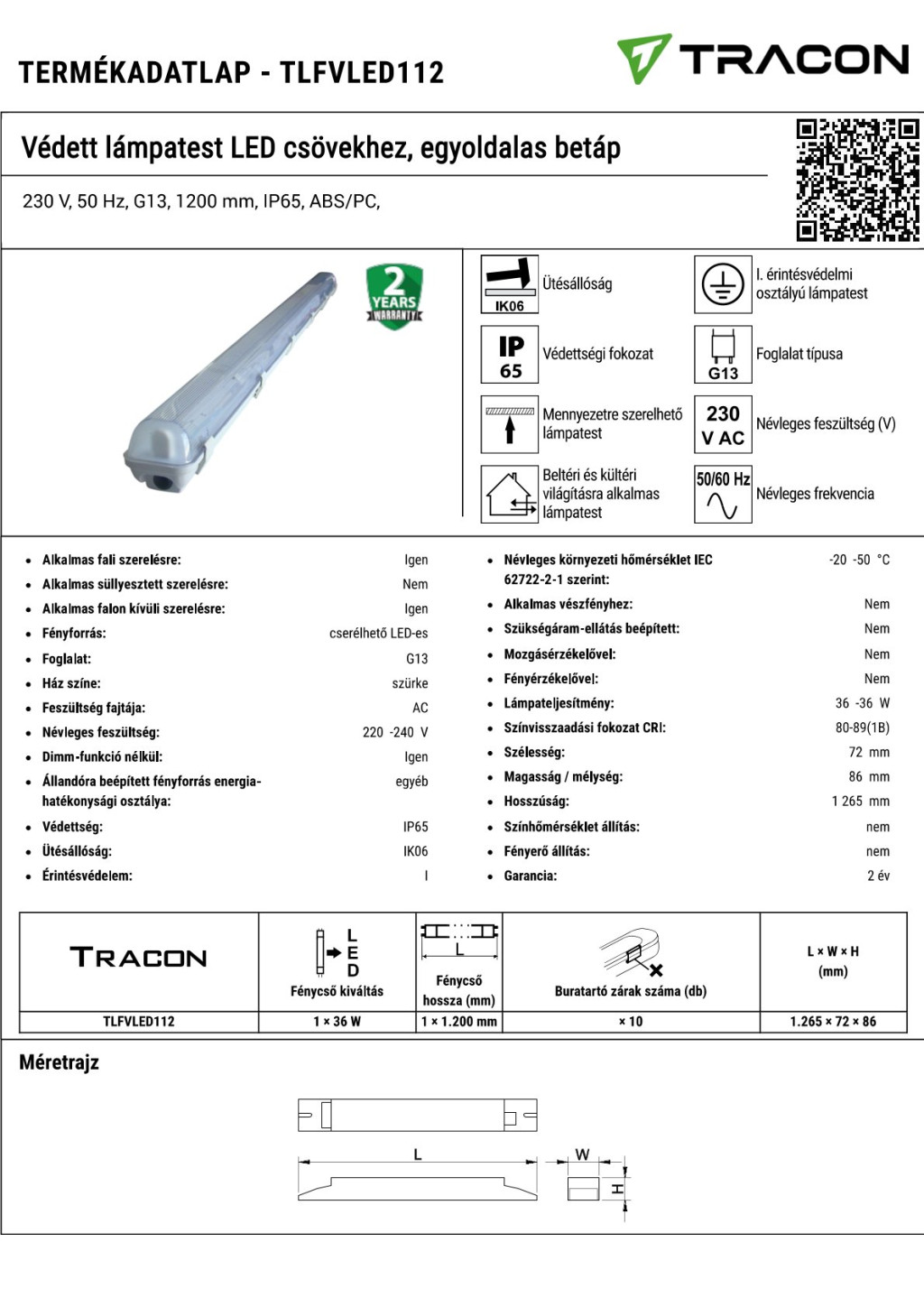 TLFVLED112 Védett lámpatest LED csövekhez, egyoldalas betáp230 V, 50 Hz, G13, 1200 mm, IP65, ABS/PC,