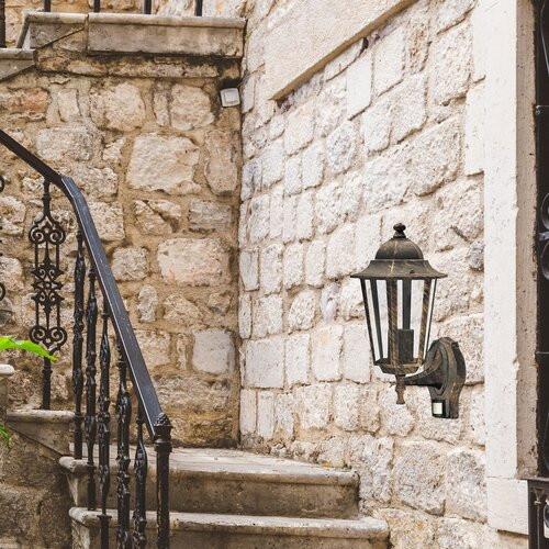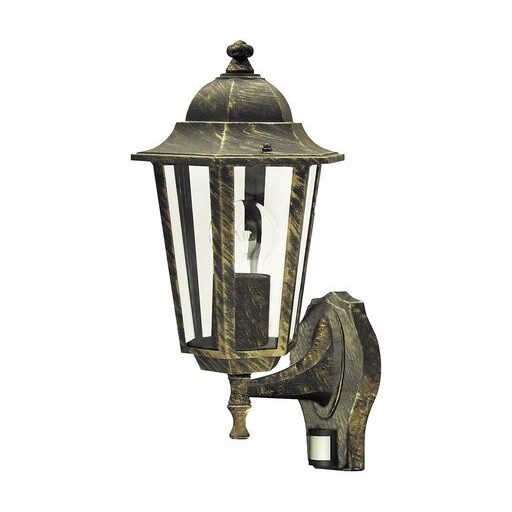 Klasszikus megjelenésű kültéri falikar 1 db foglalattal, beépített mozgásérzékelővel, felső állású kivitelben. 36 cm magas, 23 cm kinyúlású.