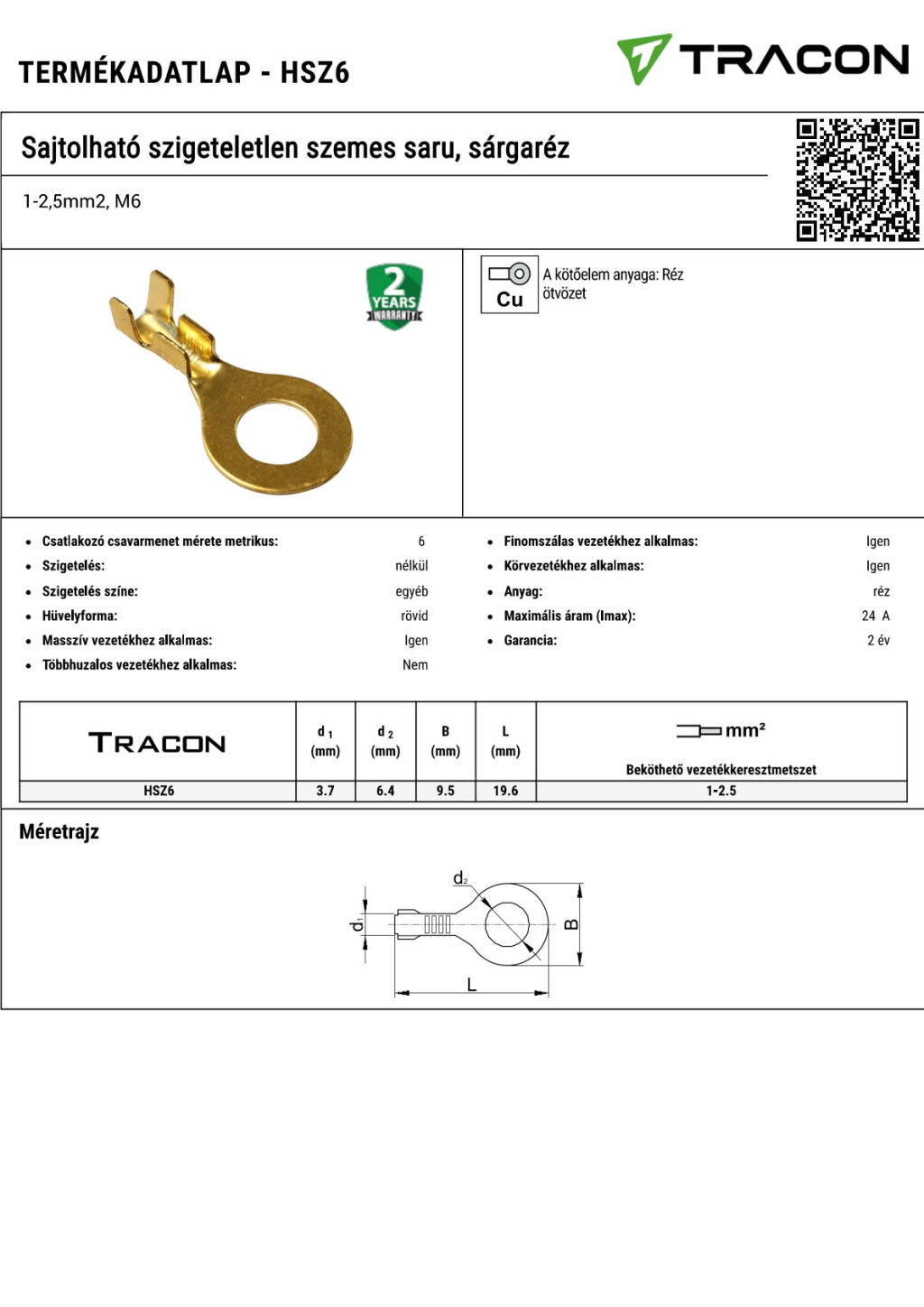 HSZ6 Sajtolható szigeteletlen szemes saru, sárgaréz1-2,5mm2, M6