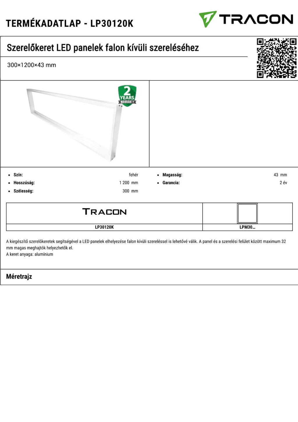 LP30120K Szerelőkeret LED panelek falon kívüli szereléséhez300×1200×43 mm
