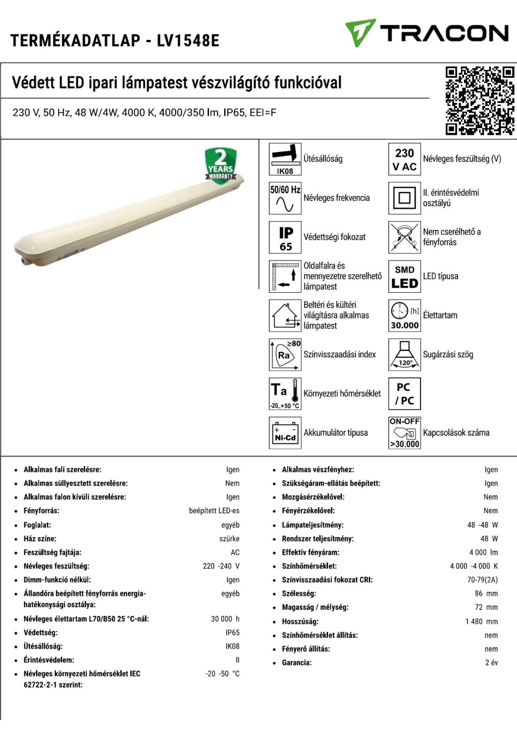 LV1548E Védett LED ipari lámpatest vészvilágító funkcióval230 V, 50 Hz, 48 W/4W, 4000 K, 4000/350 lm