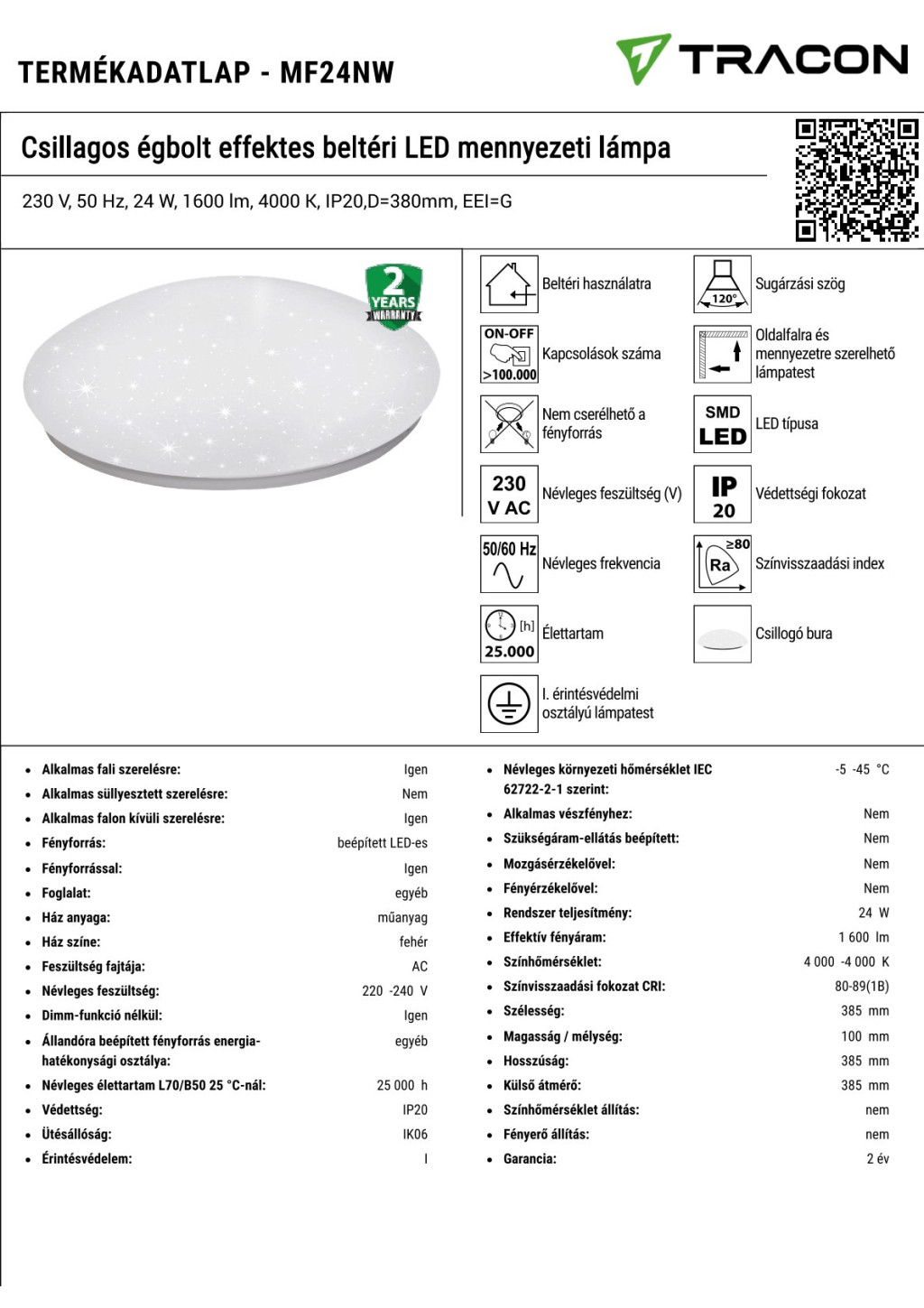 MF24NW Csillagos égbolt effektes beltéri LED mennyezeti lámpa230 V, 50 Hz, 24 W, 1600 lm, 4000 K, IP