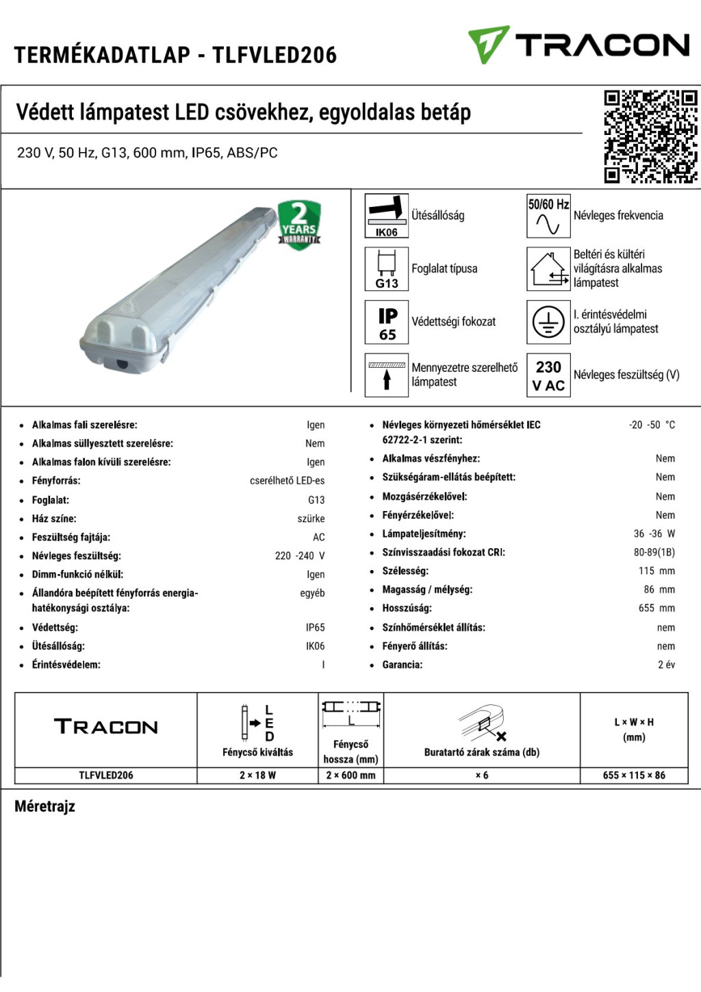 TLFVLED206 Védett lámpatest LED csövekhez, egyoldalas betáp230 V, 50 Hz, G13, 600 mm, IP65, ABS/PC