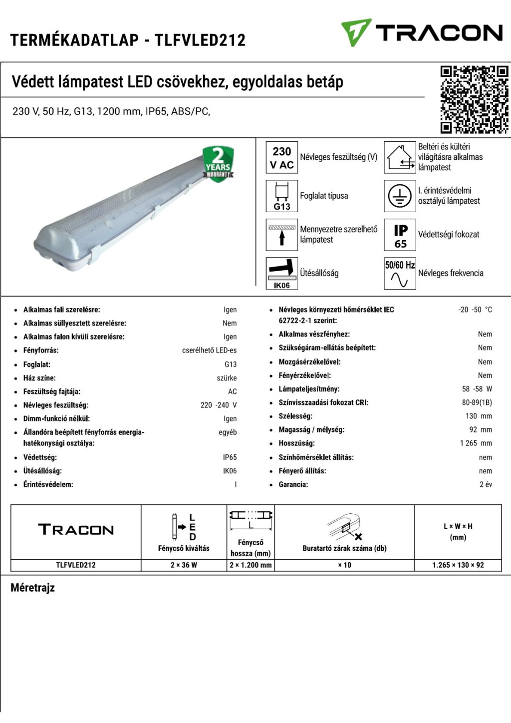 Műszaki adatok 230 V, 50 Hz, G13, 1200 mm, IP65, ABS/PC,